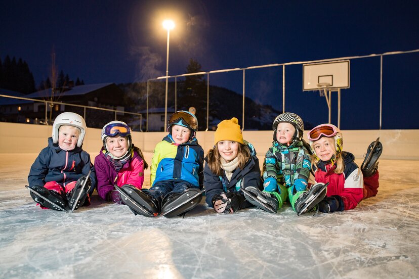 Schlittschuhe und Eisstöcke können ausgeliehen werden. Der Eislaufplatz besticht auch durch seine traumhafte Lage.