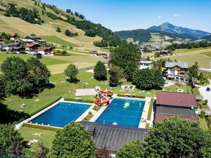 Nach einem erfrischenden Bad im Schwimmbad können sich die Kleinen auf dem Spielplatz austoben, während Eltern auf den Bänken entspannen und die Aussicht genießen.