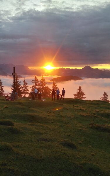 Unser Gipfel, das Kragenjoch, ist ein Kraftplatz, an dem wir gemeinsam den neuen Tag begrüßen. Wir sind rechtzeitig zum Frühstück wieder zurück.