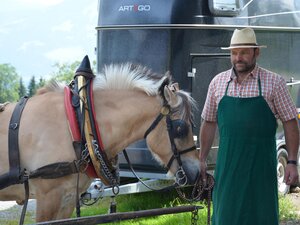 Der Lehenbauer fährt mit der Kutsche durch das romantische Dorf Thierbach.