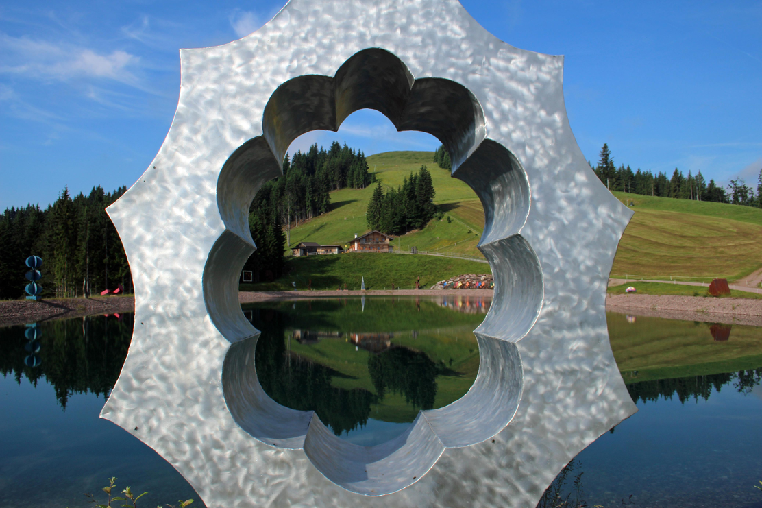 Fußgänger benötigen lediglich 1/2 Stunde von der Bergstation bis zum Speicherteich. Dort befindet sich ein Skulpturenpark beim Speichersee. Im Rahmen von "Kunst am Berg" kamen jährlich 3 neue Skulpturen zum bestehenden Park dazu - insgesamt 20 Skulpturen von internationalen Künstlern können nun dort besichtigt werden. Der Park ist schön am Speicherteich gelegen und von der Bergstation der Markbachjoch Gondelbahn gut erreichbar. Direkt beim Speichersee befindet sich die Mittermoosenalm, wo Sie meist Getränke im Trog (gegen Gebühr - es gibt dort einen kleine Geldbox) vorfinden. An den Wochenenden ist die Alm zeitweise geöffnet. Von dort aus geht es runter ins Tal, zurück nach Niederau.