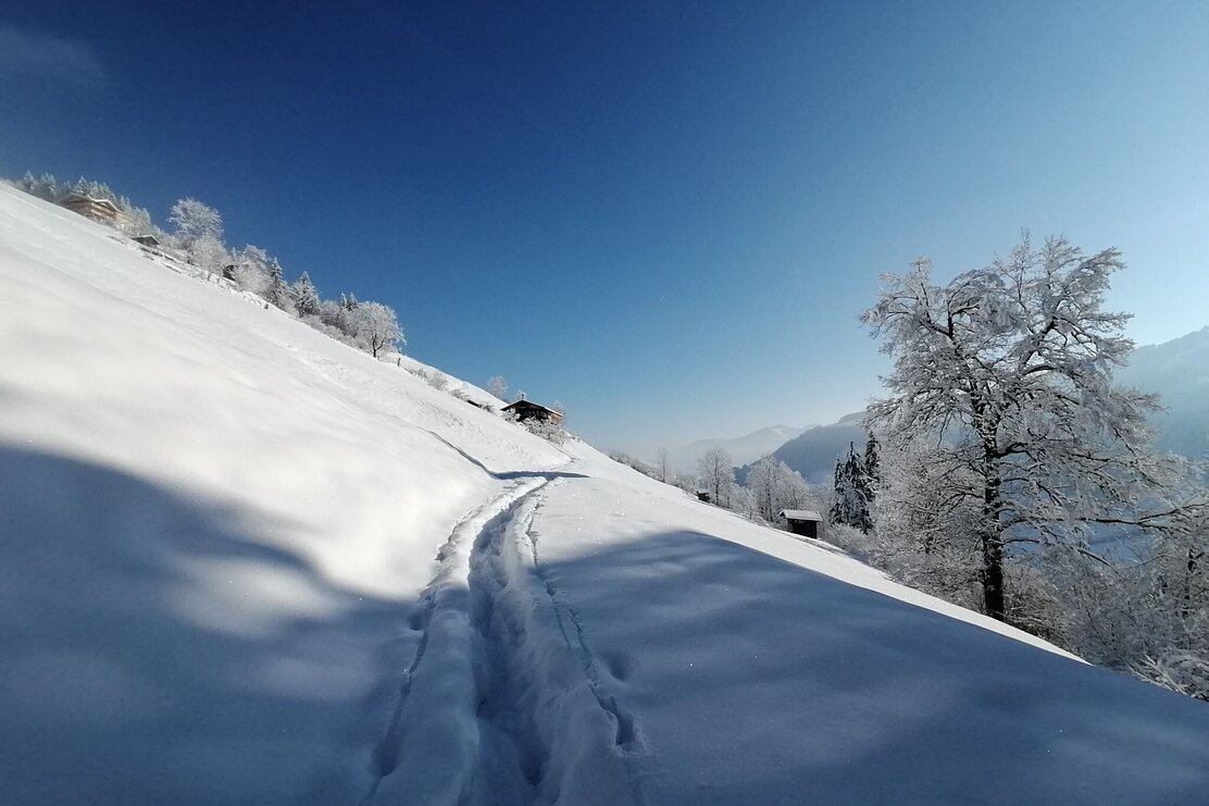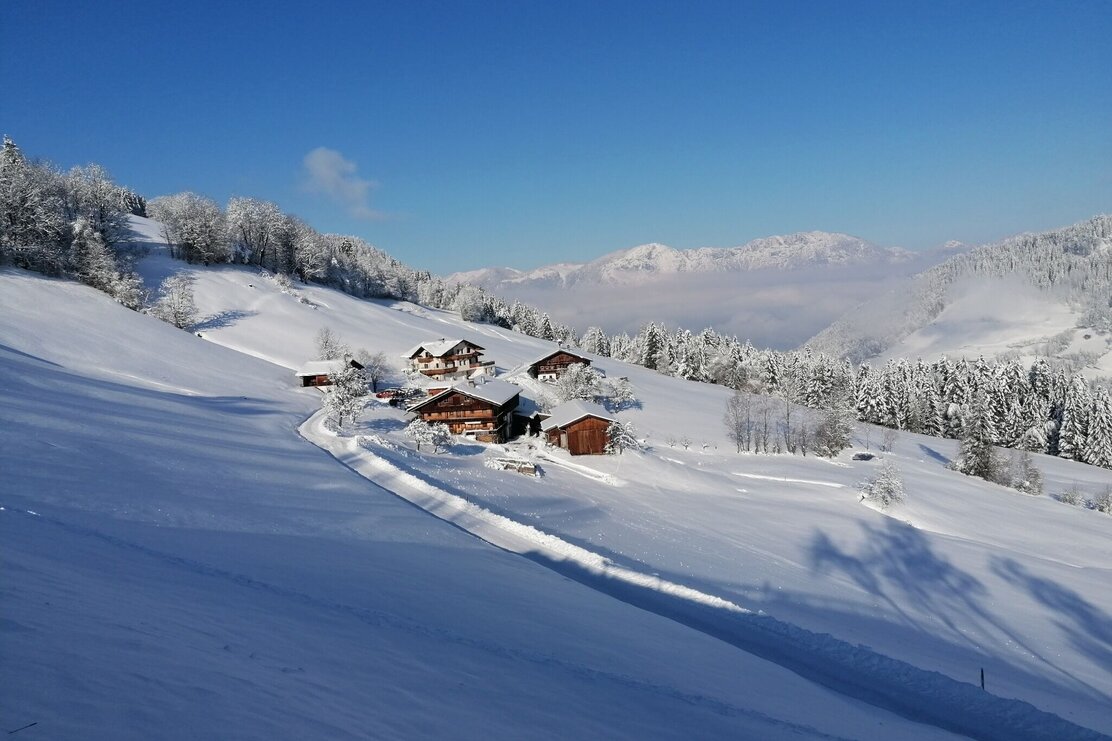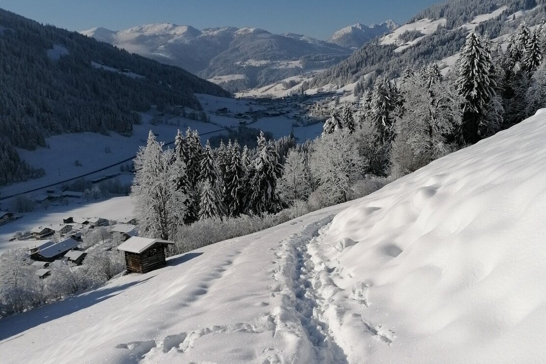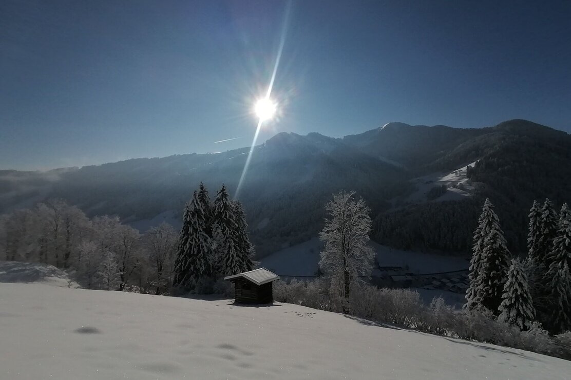 Die Tour startet in nordöstlicher Richtung. Erst entlang verschneiter Wiesen, dann in den Wald. Wir gehen an der Nordseite des Sonnberg, vorbei am Eisstein, Richtung Osten, immer wieder mit kleinen Ausblicken, auch Richtung Inntal. Auf der Ostseite queren wir ein kurzes Stück Almwiesen bis wir wieder freie Sicht haben und das Panorama richtig genießen können. Die vordere Wildschönau liegt friedlich unter uns, entlegene Höfe, auch den Wilden Kaiser erblicken wir. Wir kommen vorbei an wunderschönen, urigen Höfen am Oberhausberg, Leitschwendthof und Adelsberghof. Über eine Wiese geht es nun immer weiter nach unten in ein Waldstück über einen kleinen Graben bis nach Stocker und an der Kreuzung wieder nach oben rechts zurück zu unserem Ausgangspunkt.