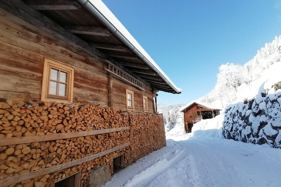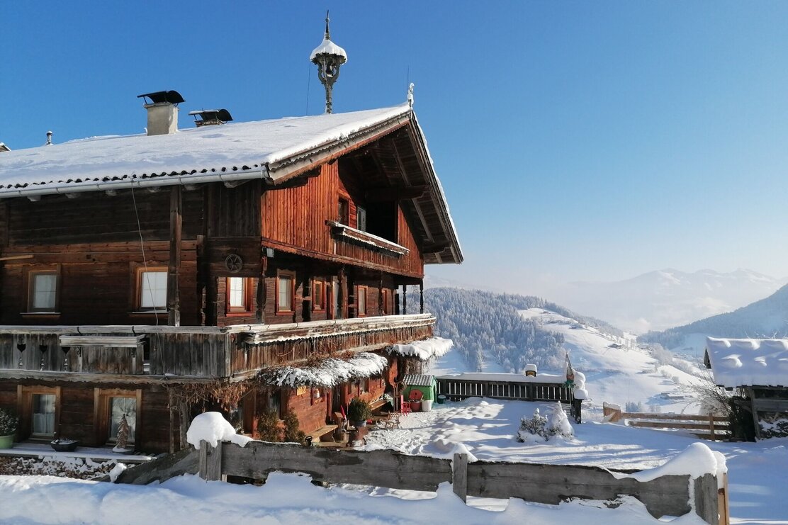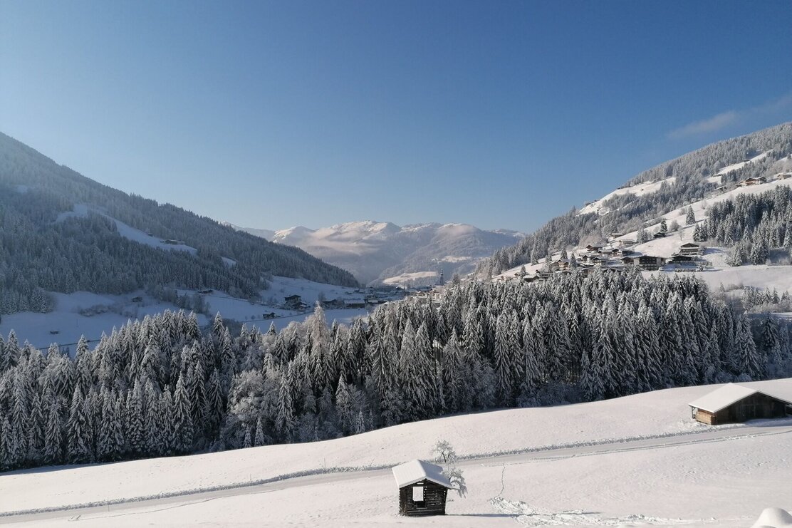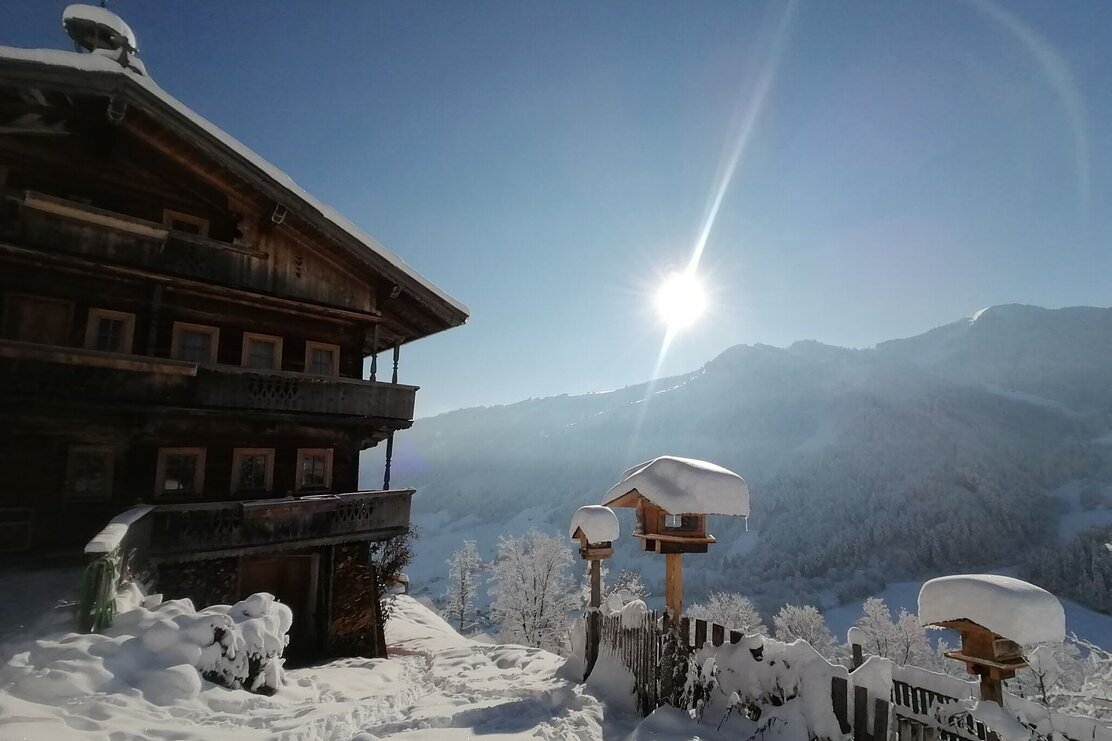 Die Tour startet in nordöstlicher Richtung. Erst entlang verschneiter Wiesen, dann in den Wald. Wir gehen an der Nordseite des Sonnberg, vorbei am Eisstein, Richtung Osten, immer wieder mit kleinen Ausblicken, auch Richtung Inntal. Auf der Ostseite queren wir ein kurzes Stück Almwiesen bis wir wieder freie Sicht haben und das Panorama richtig genießen können. Die vordere Wildschönau liegt friedlich unter uns, entlegene Höfe, auch den Wilden Kaiser erblicken wir. Wir kommen vorbei an wunderschönen, urigen Höfen am Oberhausberg, Leitschwendthof und Adelsberghof. Über eine Wiese geht es nun immer weiter nach unten in ein Waldstück über einen kleinen Graben bis nach Stocker und an der Kreuzung wieder nach oben rechts zurück zu unserem Ausgangspunkt.