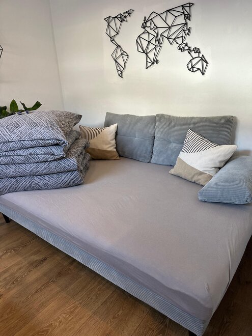 - Wohnzimmer mit ausziehbarer Couch (1,40m) für zwei Kinder oder ein Pärchen
