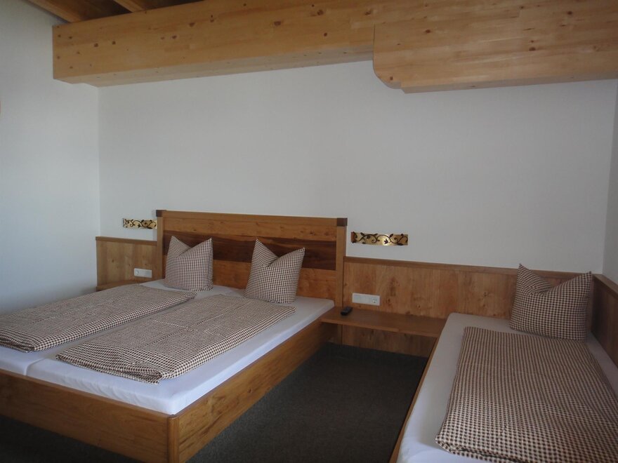 Dreibettzimmer mit 1 Doppelbett und 1 Einzelbett, barrierefreie Dusche, WC, Flat-Screen mit Teletext und integriertem Radio, WLAN Benützung, kontinuierliche Wohnraumlüftung, ohne Balkon, bis zu 3 Personen