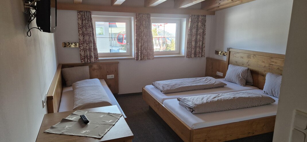 Dreibettzimmer mit 1 Doppelbett und 1 Einzelbett, barrierefreie Dusche, WC, Flat-Screen mit Teletext und integriertem Radio, WLAN Benützung, kontinuierliche Wohnraumlüftung, ohne Balkon, bis zu 3 Personen