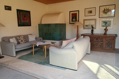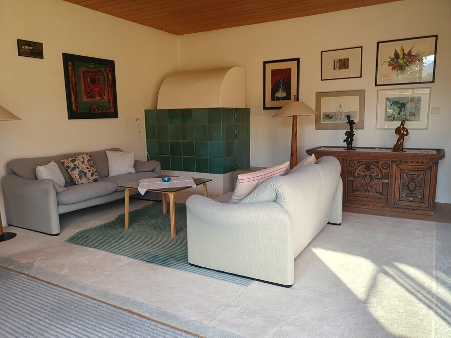 Wohnzimmer mit Kachelofen und 2 Sofas