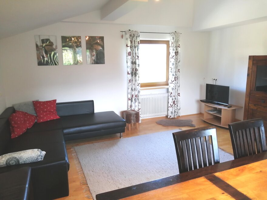 Über einen separaten Aufgang gelangt man in die 80m² Ferienwohnung im 1. Stock. Sie besitzt ein großes Wohnzimmer mit großem Esstisch, stilvoll eingerichtete Küche mit Kühlschrank mit Gefrierfach, Vorraum für Skischuhe und Bekleidung. 2 Schlafzimmer mit insgesamt 4 Betten, Badezimmer mit Dusche und WC. Ein großzügiger Gang verbindet alle Räume miteinander. Süd-West ausgerichteter