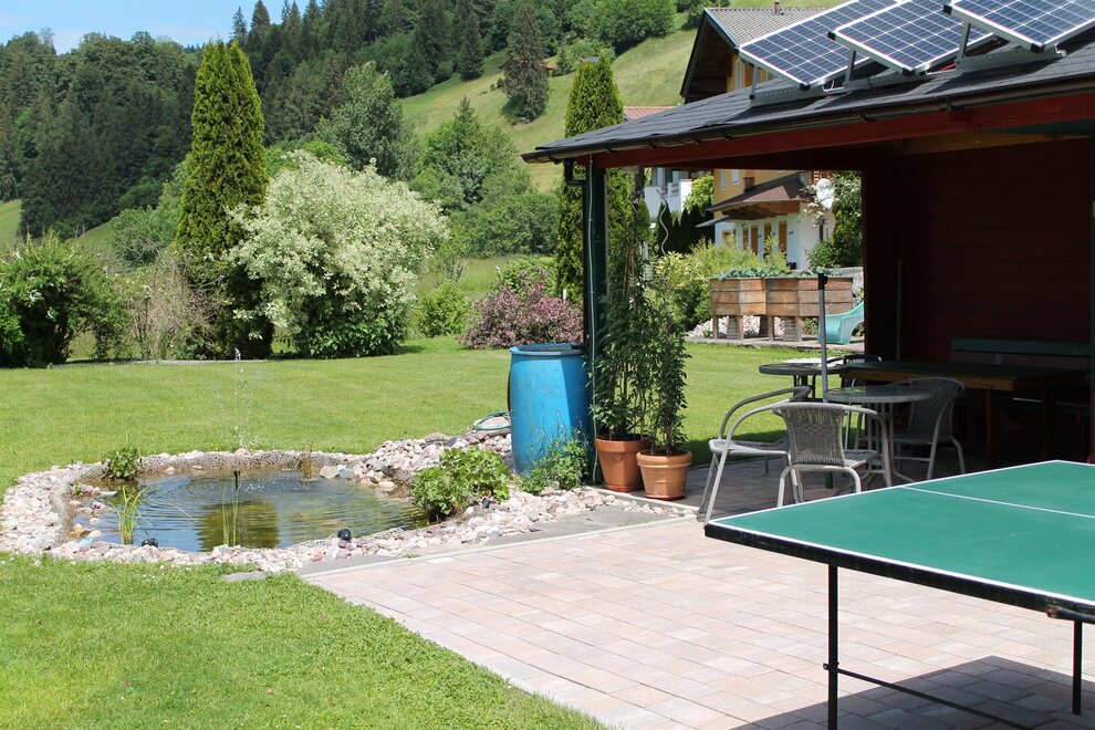 Großer Garten mit Liegewiese, Gartenteich mit Goldfischen und Gartenhaus zum Sitzen.