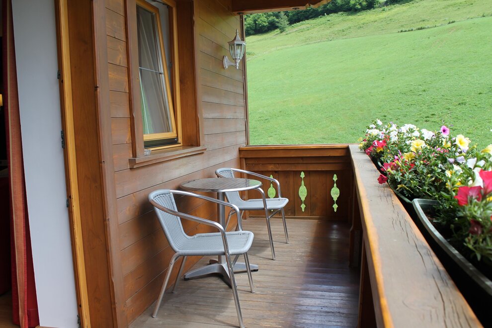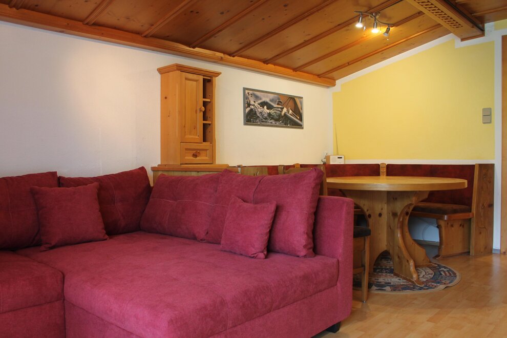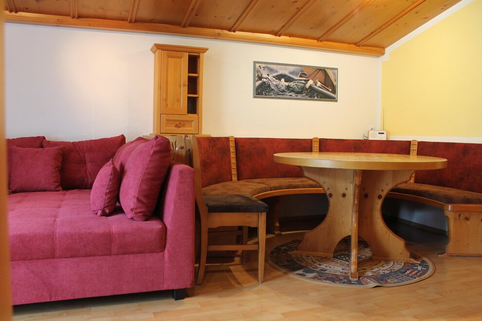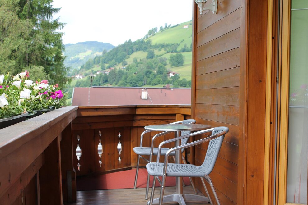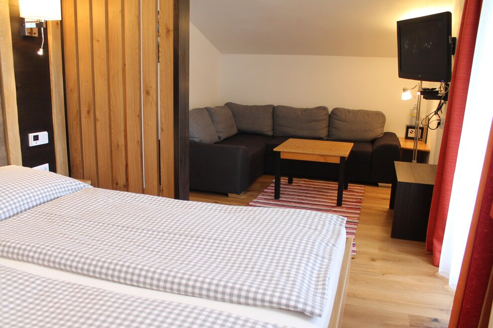 Großes, geräumiges Doppelzimmer mit runder Sitzecke, Eckcouch, Couch und großem Balkon mit Tisch und Stühlen - Südseite! Schöner Blick auf das Marchbachjoch.