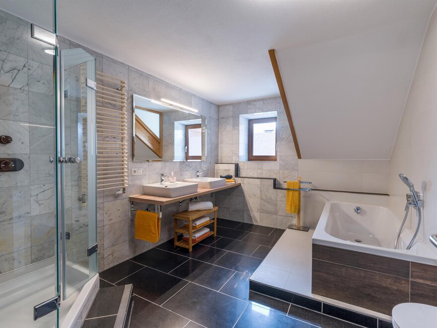 Doppelwaschbecken, Separates WC, Badewanne, Fließendes Kalt- und Warmwasser, Toiletten Anzahl: 2, Dusche, Bidet, Bad, WC
