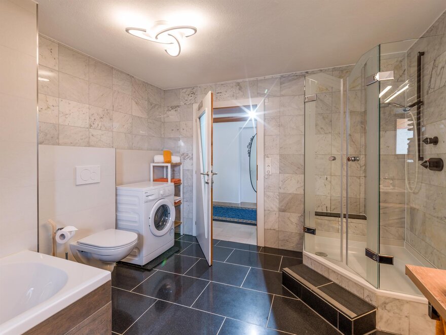 Charmante Ferienwohnung auf großzügigen 114 m², mit herrlichem Blick auf Wiesen und Berge. Küche mit allem was man braucht und großem Tisch zum gemütlichen zusammen sitzen . Sehr großes Bad mit Dusche, Badewanne, Doppelwaschbecken, Waschmaschine. Eine extra Toilette ( im Eingangsbereich). 2 Schlafzimmer mit je einem Doppelbett und einem Einzelbett. Bei Bedarf Babybett und Zusatzbett.