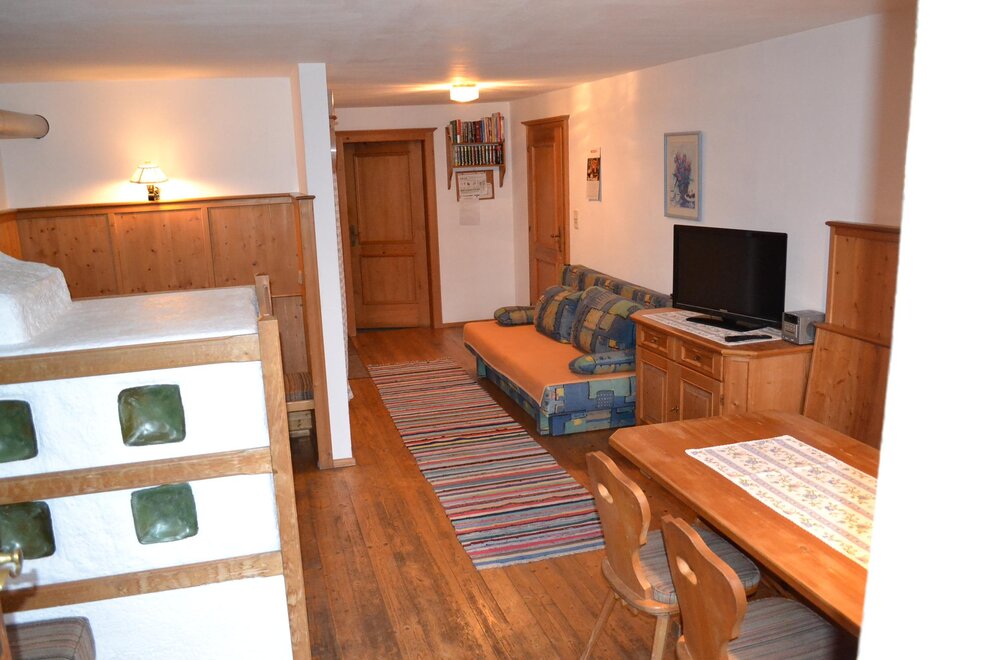56 m2“, 1 grosses Schlafzimmer mit 4 Betten, Wohnraum mit Kachelofen und Couch zum Schlafen, DU/WC, Küche (kein Backrohr vorhanden!).