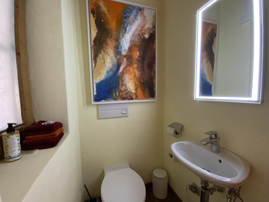 Die Ferienwohnung umfasst ein sehr großzügiges Schlafzimmer (Luxusbett 180/200 cm, Daybett 90/200 cm, TV, Infrarot-Wellness-Liege...), angrenzendes Badezimmer, ein weiteres Schlafzimmer ( Bett 160/200 cm ), ein Extra-WC, eine Wohnküche mit Kochinsel und großer Tischgruppe, Ecksofa und TV, einen Schrankraum mit Waschmaschine, Flur. Auf dem Balkon befindet sich auch eine große Tischgruppe. Der Garten incl. Außensauna ( 2 Abende pro Woche gratis ) stehen zur alleinigen Nutzung. Unter den Arkaden befindet sich der umfangreiche Fitnessbereich. Je nach Verfügbarkeit können 2 Trekking E Bikes bzw. im Winter 2 Schlitten kostenfrei genutzt werden. Die Polsterbetten in Boxspringoptik sind mit hochwertigen Naturlatexzonenmatratzen und Naturbettwaren sowie Baumwollbettwäsche ausgestattet. In das große Schlafzimmer können für die Kinder auf Wunsch ein Babybett (70/140 cm) gestellt werden. Im gesamten Haus gibt es farbenfrohe, originale Bilder.