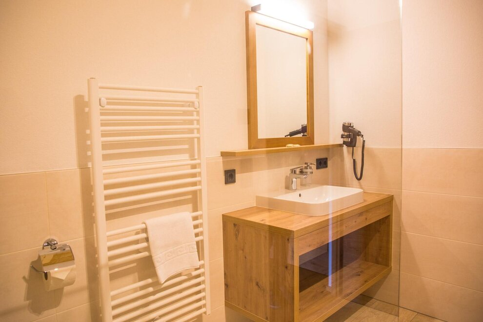 Wohlfühl-Badezimmer mit Dusche und WC, Handtücher und Föhn