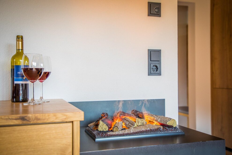 heimeliger, gemütliche Holzdecke in der ganzen Ferienwohnung, Holz-Fußboden mit Bodenheizung, Holz-Garderobe, gemütliches Sofa(Schlafcouch für 1-2 Personen),mit Sat-TV, Sitzgelegenheit mit Holztisch und Effektfeuerkamin, Süd-Balkon,Wlan