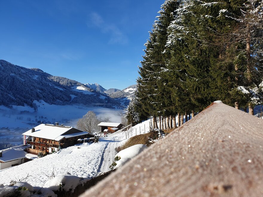 Draußen befindet sich eine große Terrasse bzw. Balkon mit herrlichem Blick ins Tal