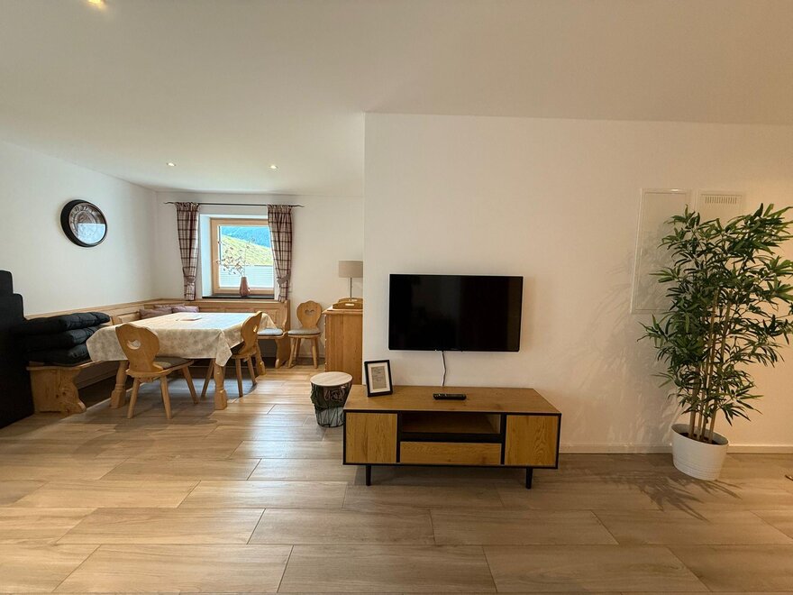 Wohn/Esszimmer mit Flat-TV mit Couch, Esstisch mit Eckbank