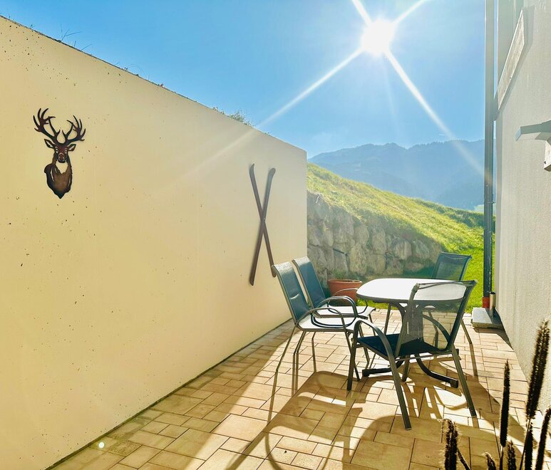 Terrasse mit Bergblick direkt zum Skigebiet Roggenboden