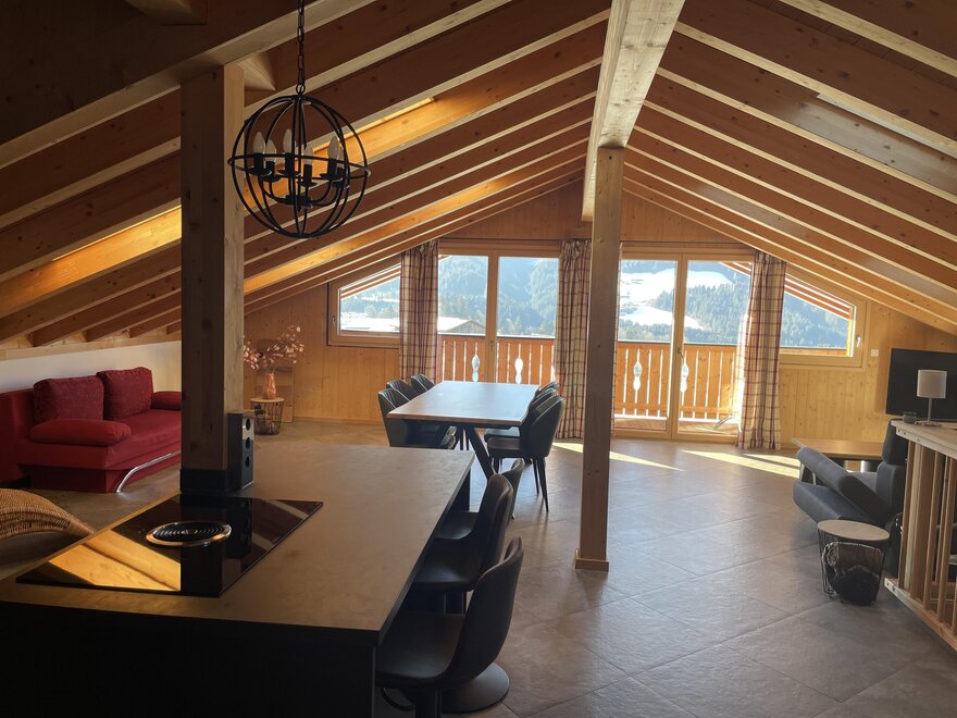 Die Ferienwohnungen sind alle modern mit teilweise rustikalen Holzakzenten eingerichtet. Jede Wohnung ist mit Süd-Terrasse oder Süd-Balkon ausgestattet und erlaubt einen umwerfenden Blick auf den Schatzberg sowie auf das Familienskigebiet Roggenboden.