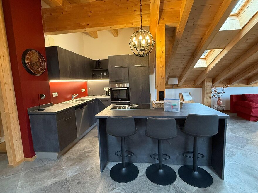 Voll eingerichtete Küchenzeile mit Herd, Geschirrspüler, Kühlschrank mit Gefrierfach, Kaffeemaschine, Wasserkocher, Koch- und Essgeschirr, etc.
