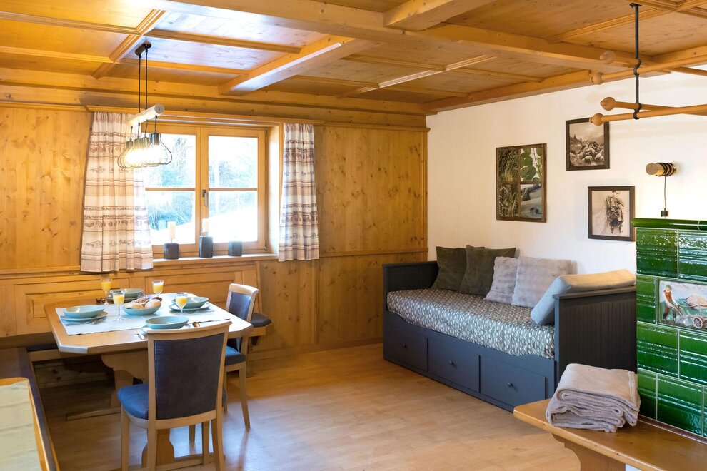 Wohnküche mit Holzherd und Stube mit Kachelofen