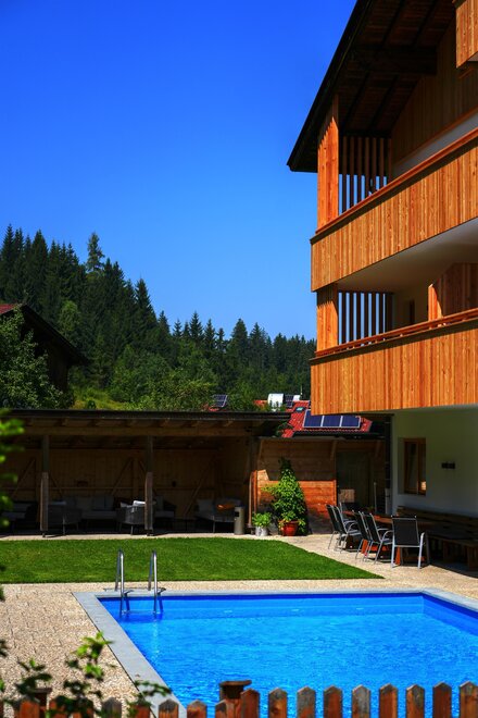 The Apartment Waldveilchen is 60m² in size and accommodates 2 to 6 people. It features a separate bedroom with a double bed as well as a bedroom with a single bed that can optionally be converted into a bunk bed. It offers a fully equipped kitchen-living room and a comfortable sofa bed. The bathroom is equipped with a rain shower. The large balcony offers a wonderful view of the forest and the pool.