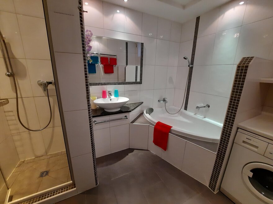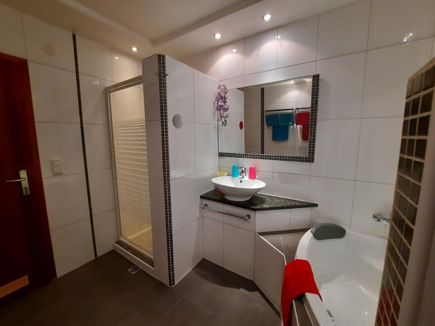 We have a well equipped living room/kitchen with cosy dining area, dishwasher, large sofa, SAT-TV with flat screen and of course free WiFi. The bathroom is large with bath and shower and a washing machine. The WC is separate.