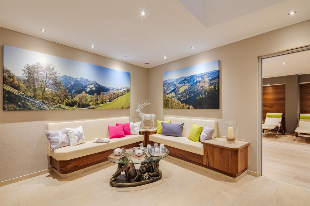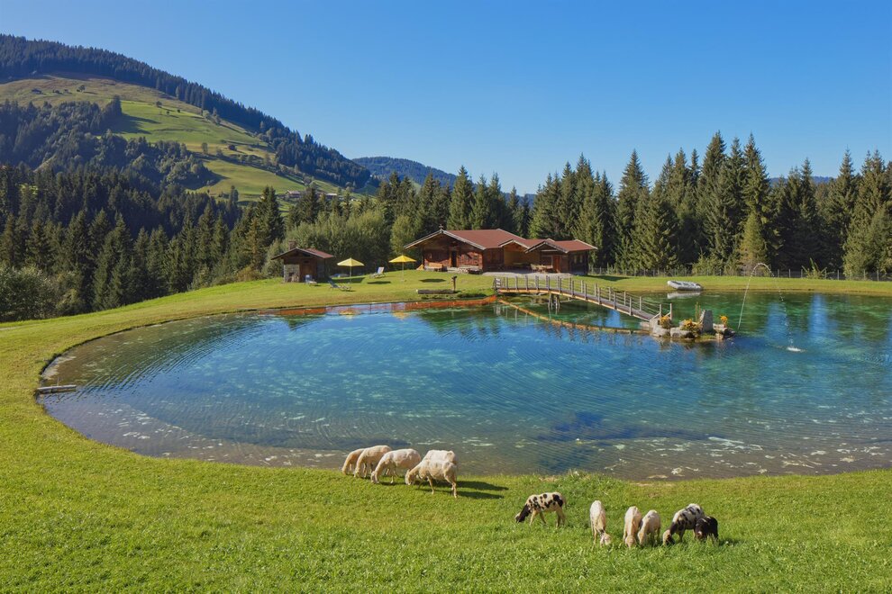 The Apparthotel Talhof is a small 4-star family hotel with an indoor pool, sauna, steam bath, infrared cabin, relaxation lounge, rest room, sun terrace, children's playrooms, and a hotel's own sheepfold with a natural lake, directly on the 300 km hiking network at the sun plateau Roggenboden in the Kitzbühel Alps.