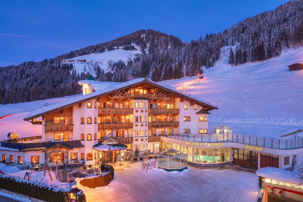 The Apparthotel Talhof is a small 4-star family hotel with an indoor pool, sauna, steam bath, infrared cabin, relaxation lounge, rest room, sun terrace, children's playrooms, and a hotel's own sheepfold with a natural lake, directly on the 300 km hiking network at the sun plateau Roggenboden in the Kitzbühel Alps.
