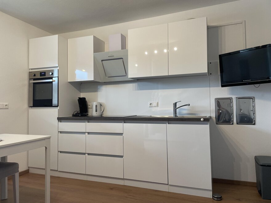 anteroom, TV, kitchen utensils, deck chairs, kitchen, electric stove, vent hood, heater, wheelchair accessible room/apt., cooking possibilities, island kitchen, dishwasher, dining room, weekly cleaning, good as new room/apt., closet, bed linen available, towels available, use of washmachine, combined bedroom/living room, family room/apt., barrier free according to DIN, dish sink, no carpet, room/apt. (non-allergic), garden furniture, kettle, garden, freezer compartment, toaster, open plan kitchen/living room, oven, coffeemaker, dishes available, refrigerator, central heating