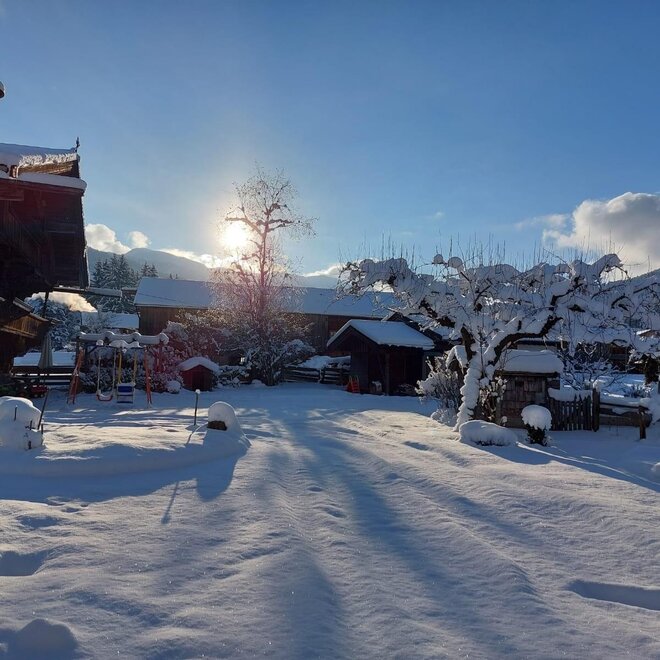 A separate staircase leads to the 80m² holiday apartment on the 1st floor. It has a large living room with a large dining table, stylish, fully equipped kitchen, hall for ski boots and clothing. 2 bedrooms with a total of 4 beds, bathroom, shower and toilet. South-west oriented