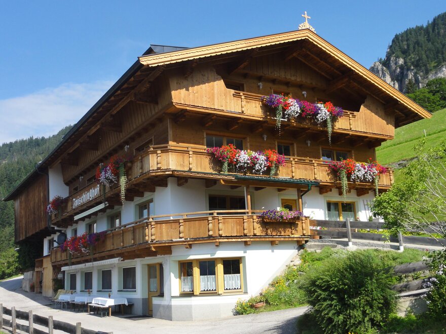 Our Foischinghof is a very beautiful cozy mountain hut in a wonderful quiet panoramic location. It is very well suited for groups of up to 46 people, making it ideal for a holiday with friends and families, for children, churches and youth retreats, for days of reflection, seminars, and group leisure activities, for anyone who appreciates and seeks a calm and pleasant atmosphere. There are 13 nice family rooms with wash facilities, sufficient showers and toilet facilities, a lounge and playroom, as well as a very cozy dining room available. Outdoors, we offer a barbecue hut for sociable barbecues with a campfire option, as well as a playground with a trampoline, swings, and slides, and a small football pitch. In bad weather, there is the possibility to defy the weather in our play barn.