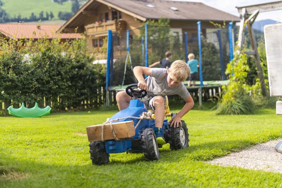 Welcome to the Hartlhof family farm - the Tyrolean family nest and certified children's farm. Our organic farm in the Kitzbühel Alps is located directly on the Markbachjochbahn in the Skijuwel Wildschönau-Alpachtal ski area and is the ideal starting point for your family vacation. In the large play garden right next to the house, parents can relax while the children let off steam in the trampoline and the giant sandpit. A slide and hat slide should not be missing, the cozy tree house with hammock is also an absolute favorite! The orchard is a wonderful natural playground, with a stream, stones and branches to build dams and trees to climb. In the house there is a small, nice play area with a play kitchen, books, Lego Duplo and much more. to disposal. In the Obstangerl our dwarf goats and sheep are happy to be petted, the chickens and ducks can be seen scratching in the meadow. Muizl and Lilly, our cats come to cuddle.