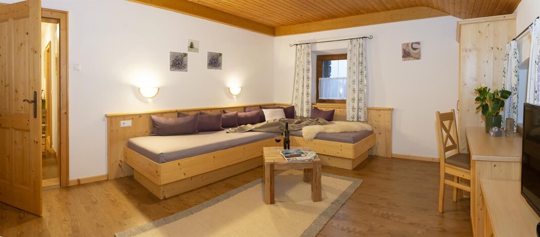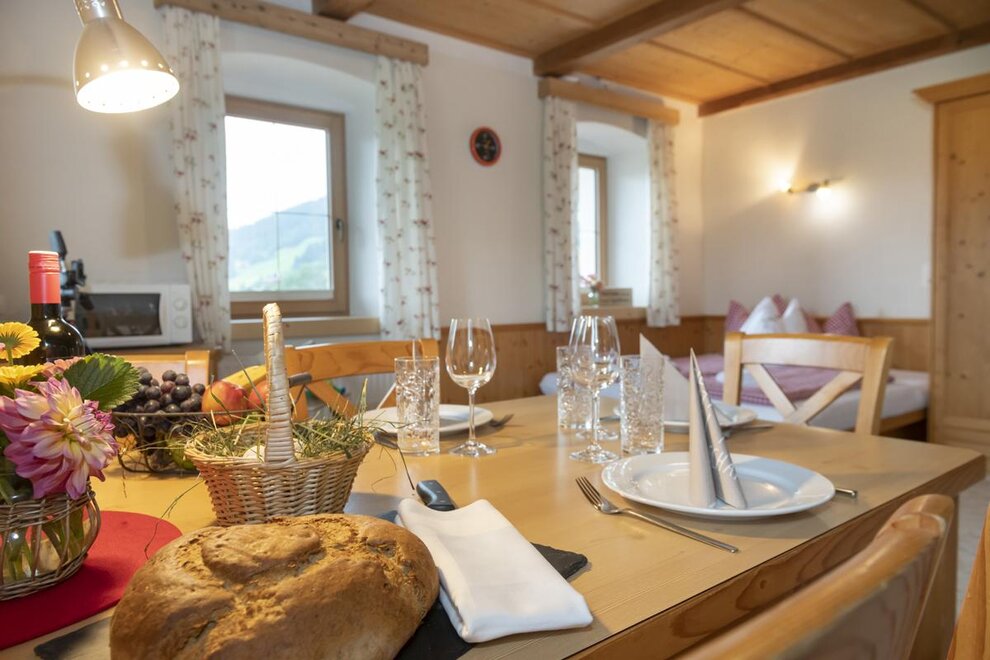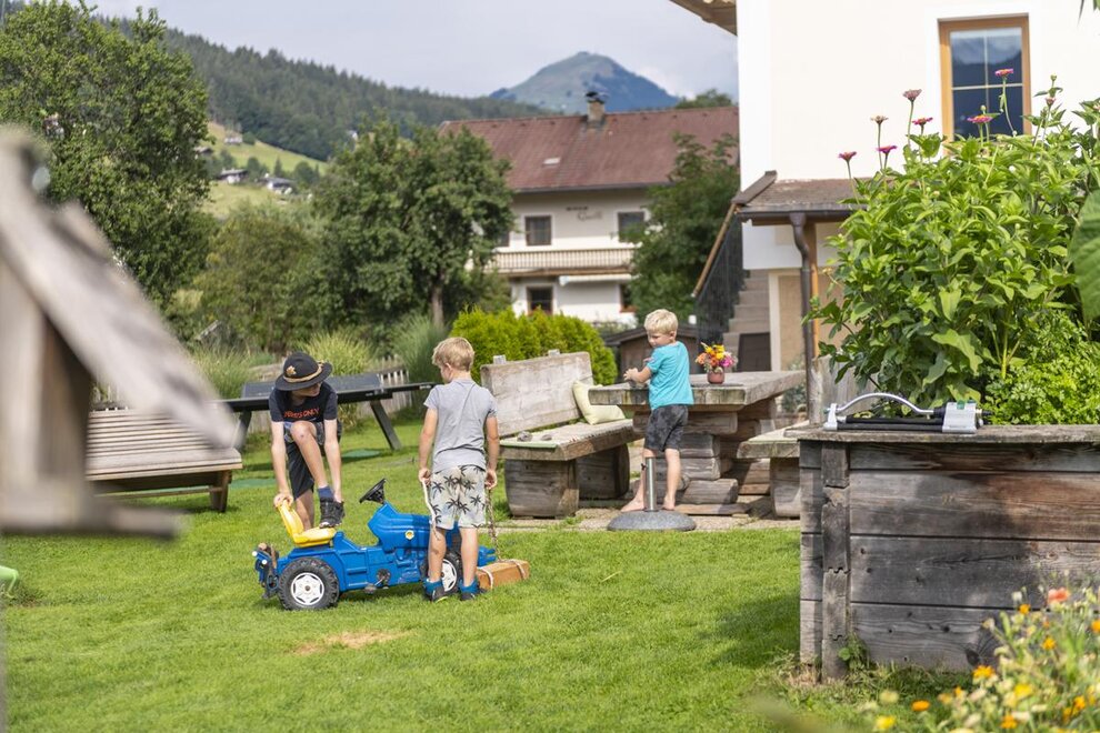 Welcome to the Hartlhof family farm - the Tyrolean family nest and certified children's farm. Our organic farm in the Kitzbühel Alps is located directly on the Markbachjochbahn in the Skijuwel Wildschönau-Alpachtal ski area and is the ideal starting point for your family vacation. In the large play garden right next to the house, parents can relax while the children let off steam in the trampoline and the giant sandpit. A slide and hat slide should not be missing, the cozy tree house with hammock is also an absolute favorite! The orchard is a wonderful natural playground, with a stream, stones and branches to build dams and trees to climb. In the house there is a small, nice play area with a play kitchen, books, Lego Duplo and much more. to disposal. In the Obstangerl our dwarf goats and sheep are happy to be petted, the chickens and ducks can be seen scratching in the meadow. Muizl and Lilly, our cats come to cuddle.