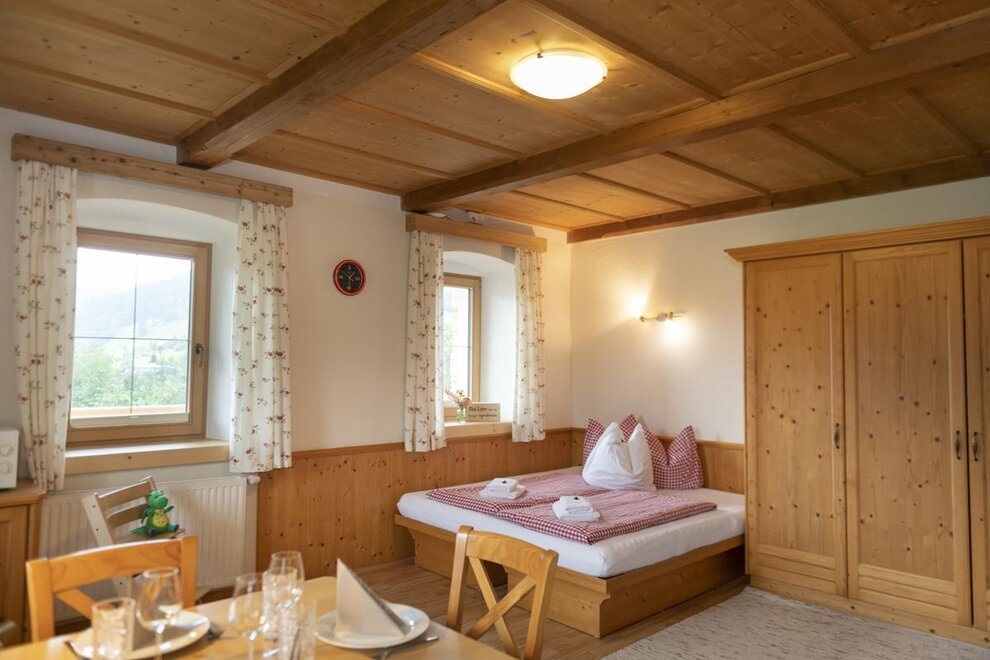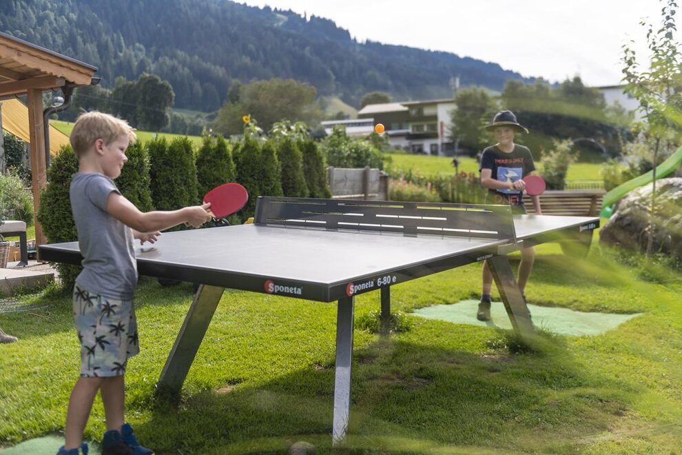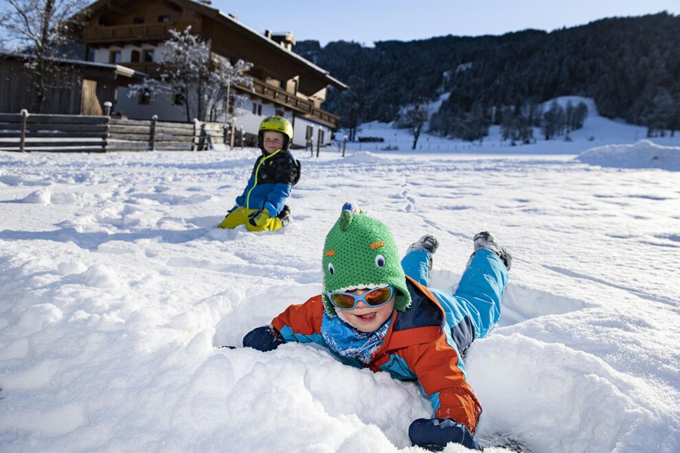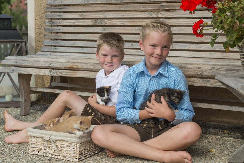 Welcome to the Hartlhof family farm - the Tyrolean family nest and certified children's farm. Our organic farm in the Kitzbühel Alps is located directly on the Markbachjochbahn in the Skijuwel Wildschönau-Alpachtal ski area and is the ideal starting point for your family vacation. In the large play garden right next to the house, parents can relax while the children let off steam in the trampoline and the giant sandpit. A slide and hat slide should not be missing, the cozy tree house with hammock is also an absolute favorite! The orchard is a wonderful natural playground, with a stream, stones and branches to build dams and trees to climb. In the house there is a small, nice play area with a play kitchen, books, Lego Duplo and much more. to disposal. In the Obstangerl our dwarf goats and sheep are happy to be petted, the chickens and ducks can be seen scratching in the meadow. Muizl and Lilly, our cats come to cuddle.