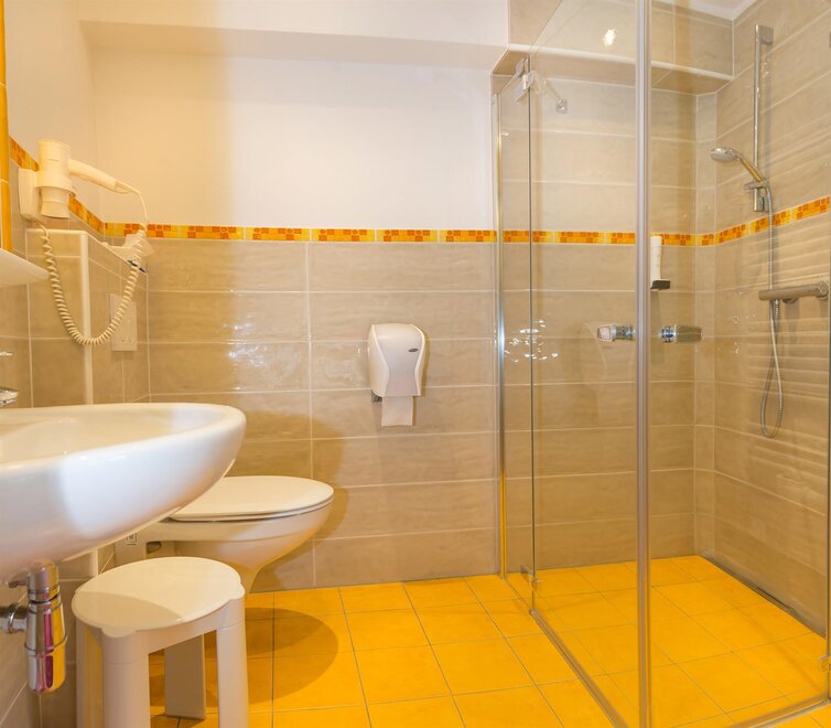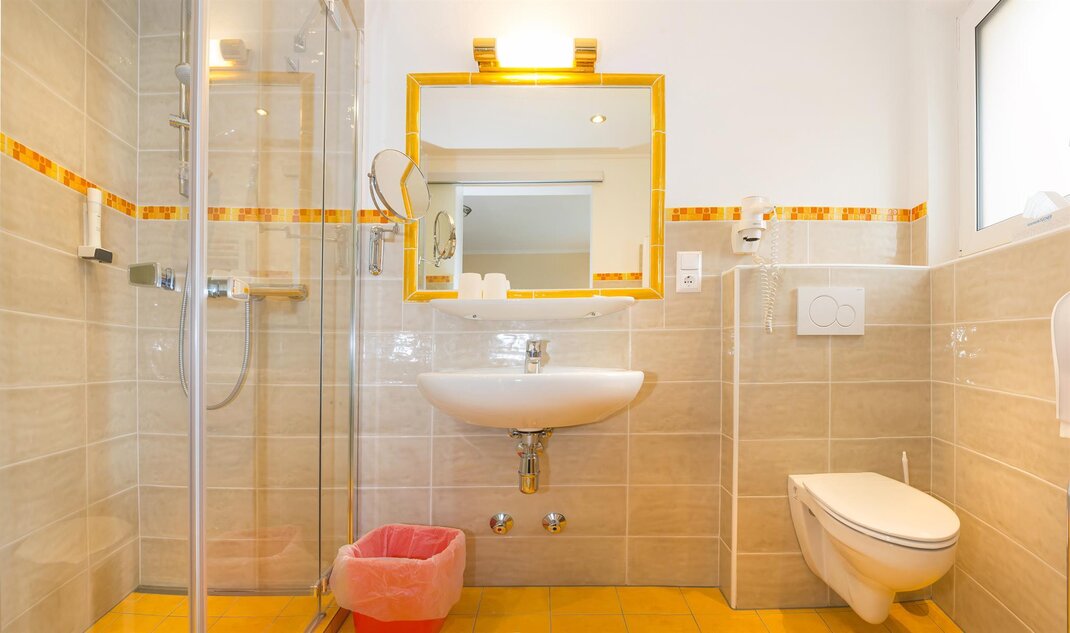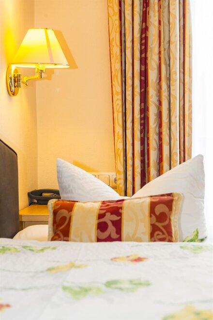 Our single rooms are approx. 12 m2 in size and are equipped as follows: box spring bed, sitting area, TV, telephone, luggage block, balcony with furniture, bathroom with shower, toilet, cosmetic mirror, shower stool, towel warmer and hair dryer.