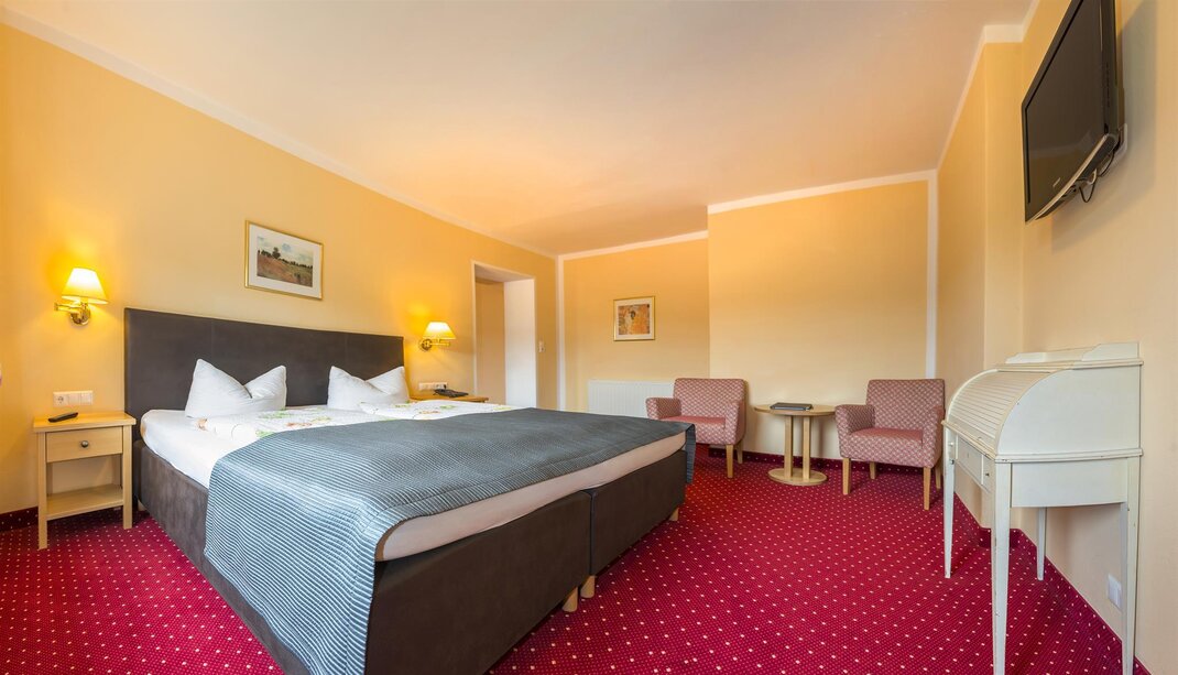 Our single rooms are approx. 12 m2 in size and are equipped as follows: box spring bed, sitting area, TV, telephone, luggage block, balcony with furniture, bathroom with shower, toilet, cosmetic mirror, shower stool, towel warmer and hair dryer.