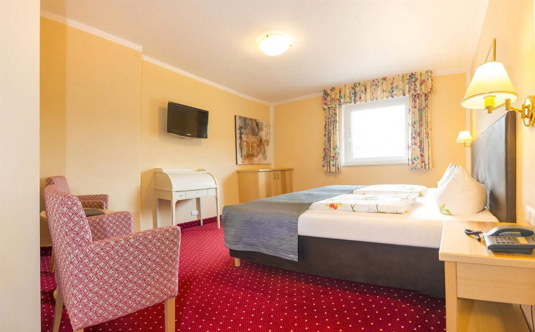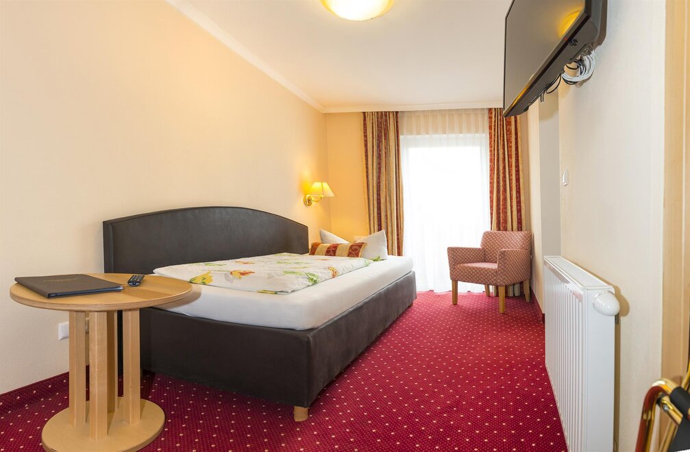 Our single rooms are approx. 12 m2 in size and are equipped as follows: box spring bed, sitting area, TV, telephone, luggage block, balcony with furniture, bathroom with shower, toilet, cosmetic mirror, shower stool, towel warmer and hair dryer.
