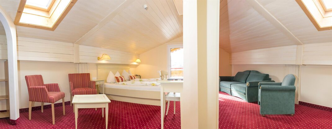 Our attic Junior Suite Snow White is about 32 m2 in size and has 2 rooms without a door in between, a sleeping area with a double bed, a living area with a double sofa bed, seating area, safe, luggage block, cloakroom, TV, telephone, balcony with patio furniture and 2 bathrooms with shower , Toilet, hairdryer, cosmetic mirror, heated towel rail & shower stool. Occupancy 2 - 6 people.