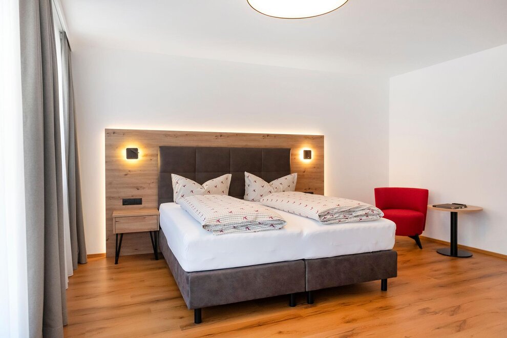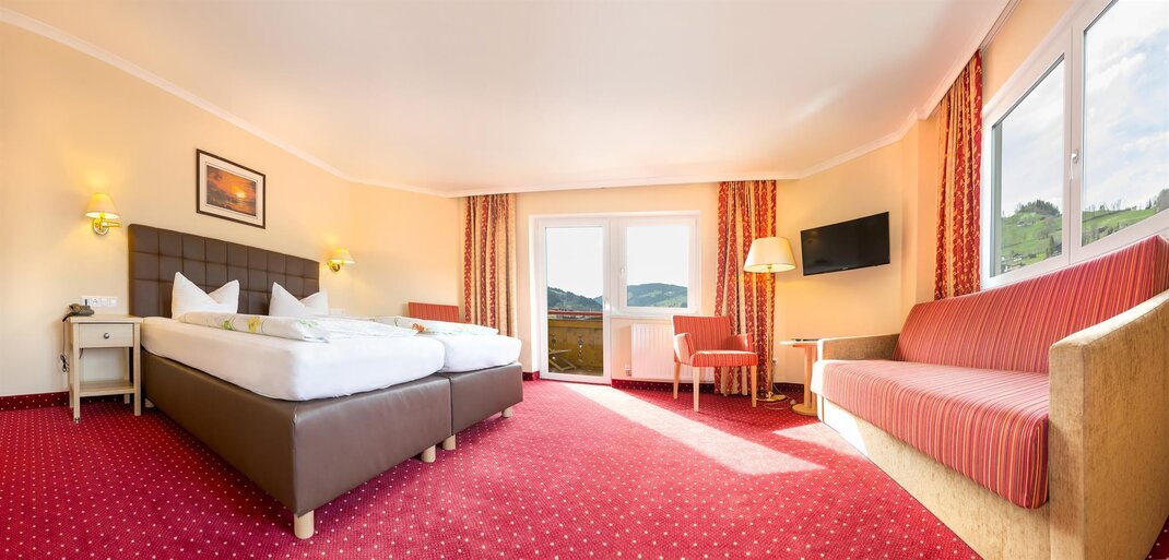 Our deluxe rooms Markbachjoch Extra are approx. 24 - 28m2 in size (newly renovated in November 2020) and are equipped with a double box spring bed which you can split into 2 Beds, a sofa bed for 2 people, seating area, safe, luggage block, wardrobe, flat screen TV, telephone, desk, minibar, Balcony with balcony furniture and bathroom with shower, toilet, hairdryer, cosmetic mirror, heated towel rail and shower stool. Occupancy 1 - 4 people.