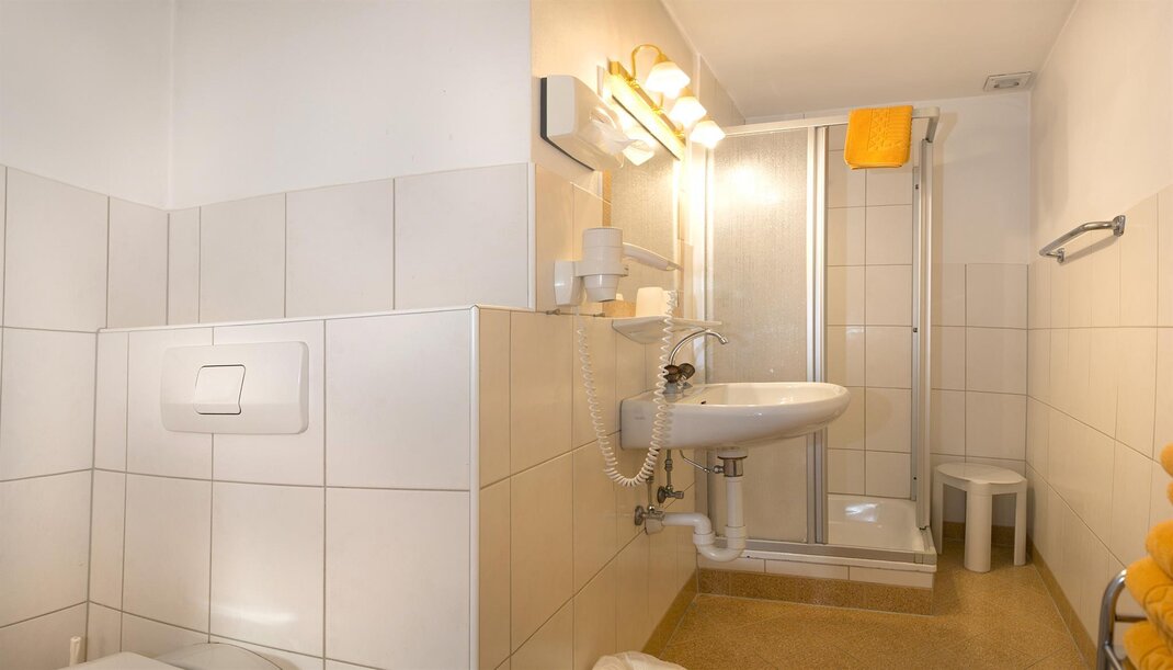 Our single rooms are approx. 12 m2 in size and are equipped as follows: box spring bed, sitting area, TV, telephone, luggage block, balcony with furniture, bathroom with shower, toilet, cosmetic mirror, shower stool, towel warmer and hair dryer.