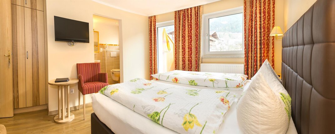 Our deluxe rooms Markbachjoch Extra are approx. 24 - 28m2 in size (newly renovated in November 2020) and are equipped with a double box spring bed which you can split into 2 Beds, a sofa bed for 2 people, seating area, safe, luggage block, wardrobe, flat screen TV, telephone, desk, minibar, Balcony with balcony furniture and bathroom with shower, toilet, hairdryer, cosmetic mirror, heated towel rail and shower stool. Occupancy 1 - 4 people.