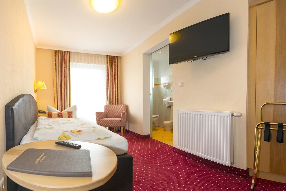 Our single rooms are approx. 12 m2 in size and are equipped as follows: box spring bed, sitting area, TV, telephone, luggage block, balcony with furniture, bathroom with shower, toilet, cosmetic mirror, shower stool, towel warmer and hair dryer.