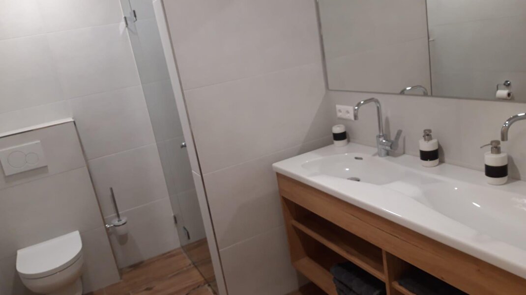 80m² apartment with living room, kitchen, 1 bathroom, shower, 2 toilets, hairdryer, cable TV, 2 bedrooms, large children's playground and balcony.