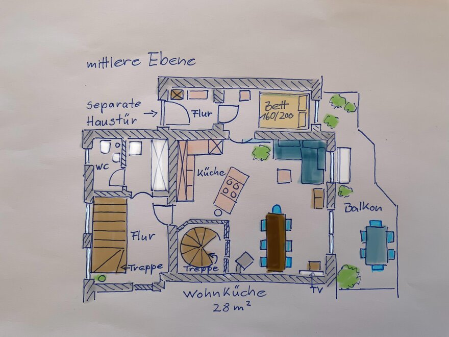 YOU enter the exceptional vacation domicile from the covered parking through the separate front door, the hallway, a small bedroom (160/200 cm bed) to the spacious living kitchen with adjoining south balcony including a dining area. On the same living level, there is also a guest WC and a storage room with a washing machine. Through the staircase, YOU reach the garden level with the large sleeping room (180/200 cm luxury bed, 90/200 cm single bed, infrared wellness lounger ), bathroom, and access to the terrace, arcades with fitness equipment & outdoor bed, garden including sauna (for private use). The spiral staircase takes YOU to the third living level with the third bedroom, two bathrooms and the large living room with access to the roof terrace.2 E-Bikes and 2 sleds are available for YOU. Ski room with ski boot dryer.