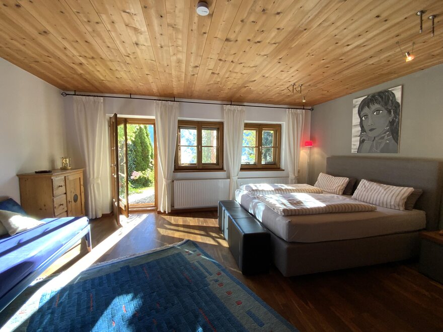 YOU enter the exceptional vacation domicile from the covered parking through the separate front door, the hallway, a small bedroom (160/200 cm bed) to the spacious living kitchen with adjoining south balcony including a dining area. On the same living level, there is also a guest WC and a storage room with a washing machine. Through the staircase, YOU reach the garden level with the large sleeping room (180/200 cm luxury bed, 90/200 cm single bed, infrared wellness lounger ), bathroom, and access to the terrace, arcades with fitness equipment & outdoor bed, garden including sauna (for private use). The spiral staircase takes YOU to the third living level with the third bedroom, two bathrooms and the large living room with access to the roof terrace.2 E-Bikes and 2 sleds are available for YOU. Ski room with ski boot dryer.