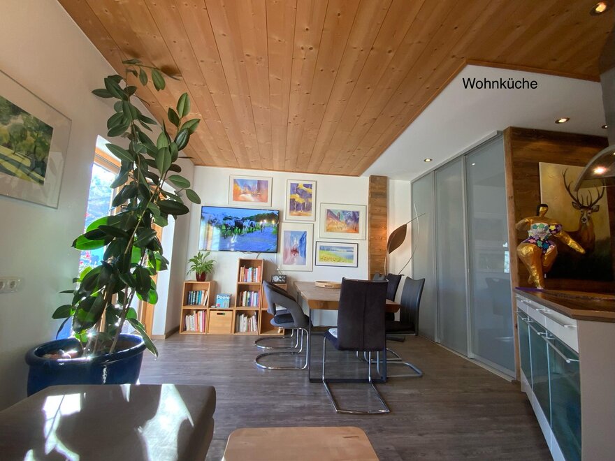 YOU enter the exceptional vacation domicile from the covered parking through the separate front door, the hallway, a small bedroom (160/200 cm bed) to the spacious living kitchen with adjoining south balcony including a dining area. On the same living level, there is also a guest WC and a storage room with a washing machine. Through the staircase, YOU reach the garden level with the large sleeping room (180/200 cm luxury bed, 90/200 cm single bed, infrared wellness lounger ), bathroom, and access to the terrace, arcades with fitness equipment & outdoor bed, garden including sauna (for private use). The spiral staircase takes YOU to the third living level with the third bedroom, two bathrooms and the large living room with access to the roof terrace.2 E-Bikes and 2 sleds are available for YOU. Ski room with ski boot dryer.