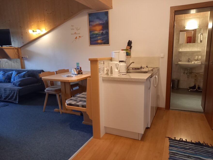 All our holiday apartments invite you to sunbathe and relax on their spacious balconies. Additionally, we have a common room with a kitchenette and TV. A double room can also be booked separately along with the holiday apartments. All holiday apartments also come with free internet access (W-LAN).