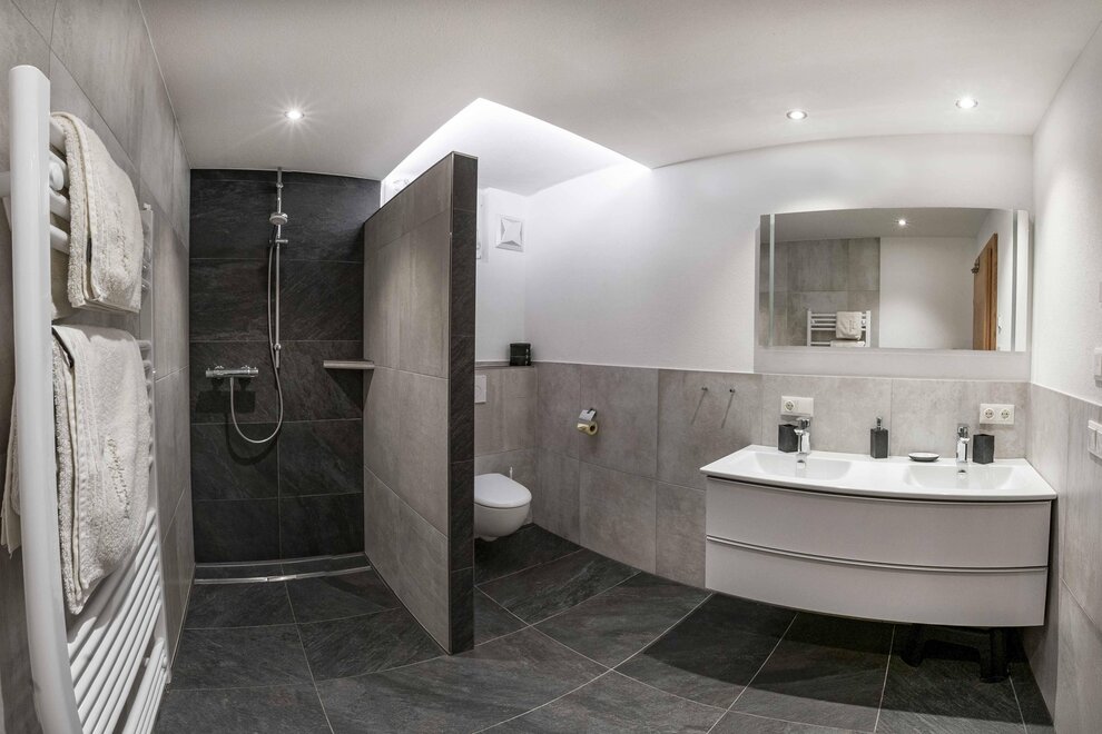 Additionally, there is a large bathroom with a shower, toilet, towel dryer, and a double washbasin. In the entrance area of the apartment, there is a separate toilet.